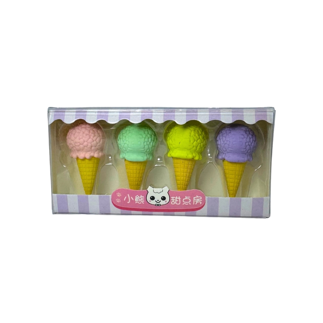 Hermoso set de 4 borradores linea cake shop con diseño de barquillas en colores pasteles